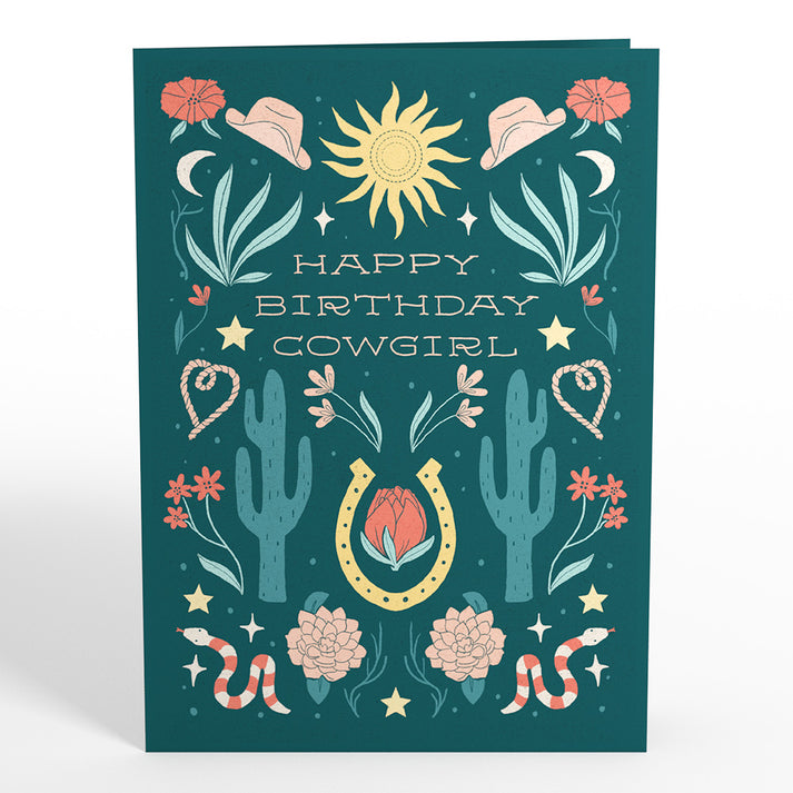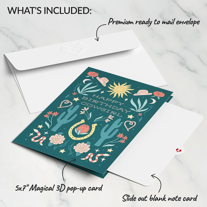 Description: Celebrate them with this delightful pop-up card featuring a vibrant Western-inspired cover with cacti, floral accents, and a horseshoe design. Inside, a 3D cowboy boot adorned with intricate floral patterns unfolds, accompanied by the message "Kick up your heels and celebrate!" This greeting card is perfect for celebrating the birthday of a cowgirl at heart, or anyone who appreciates a unique and fun birthday surprise.