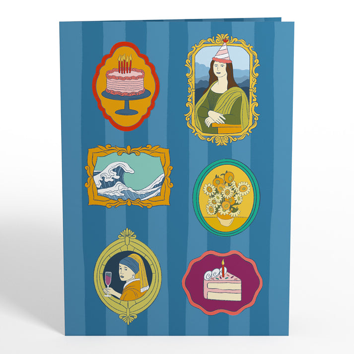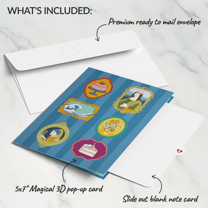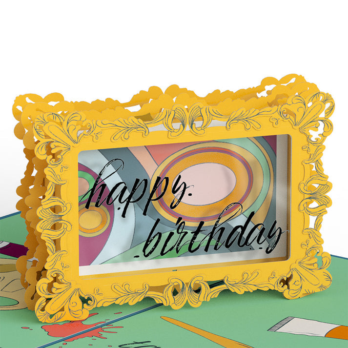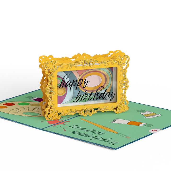 Description: This artistic pop-up card opens to reveal a 3D ornate golden frame showcasing a vibrant "Happy Birthday" message, with the words "to a true masterpiece" elegantly written below. It’s the perfect card for someone who appreciates creativity, art, or simply deserves to be celebrated as the work of art they are — ideal for a stylish friend, loved one, or anyone who lights up a room like a gallery piece.
