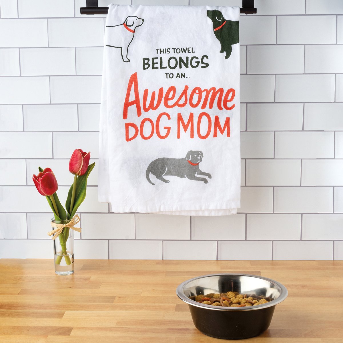 A cotton kitchen towel featuring a "This Towel Belongs To An… Awesome Dog Mom" sentiment with all-over dog designs. Our Awesome Dog Mom kitchen towel is machine-washable.