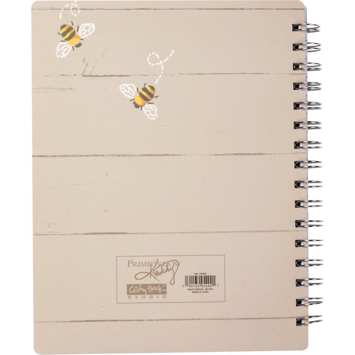 A spiral notebook lending a "Be Kind" sentiment with flower and bee designs on front and back covers. Be Kind notebook contains 120 lined pages.