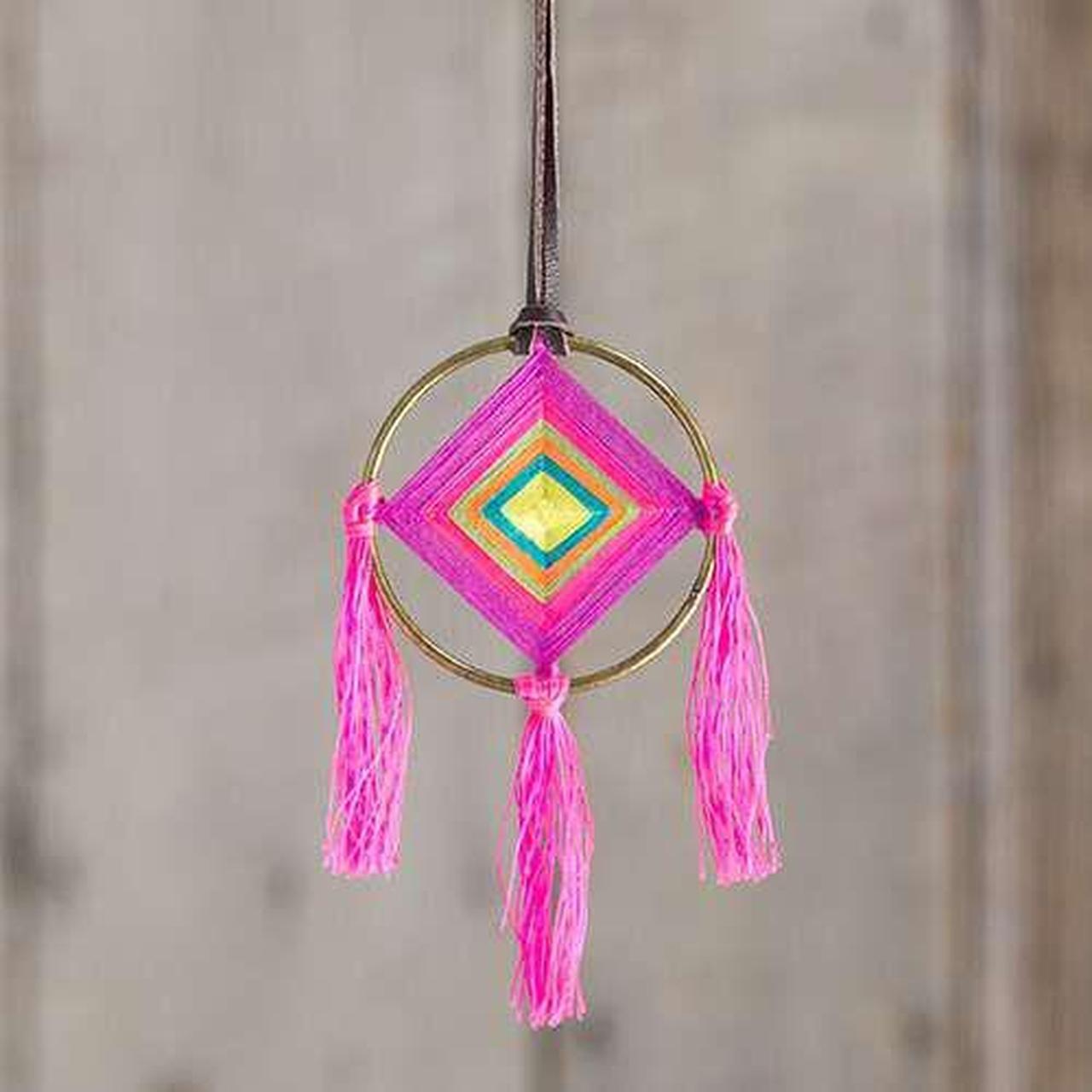 Purple God's Eye Rearview Mirror Charm by Natural Life features an antiqued brass ring is surrounded with bright neon colors with tassels. Cute boho charm for your car!