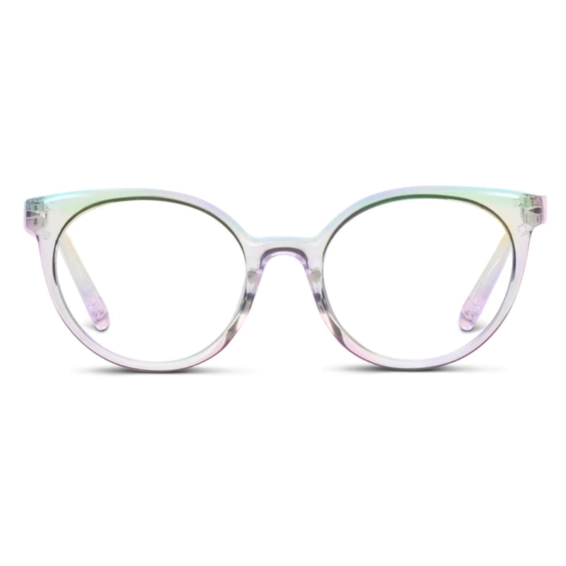 Embrace out-of-this-world style. Moonstone's alluring, iridescent coloring—in clear and smoke—will inspire you with an array of rainbow shades, depending on how the light captures it. Featuring a trend-forward, round cat eye shape, this is just the frame to capture your imagination and uplift your mood.