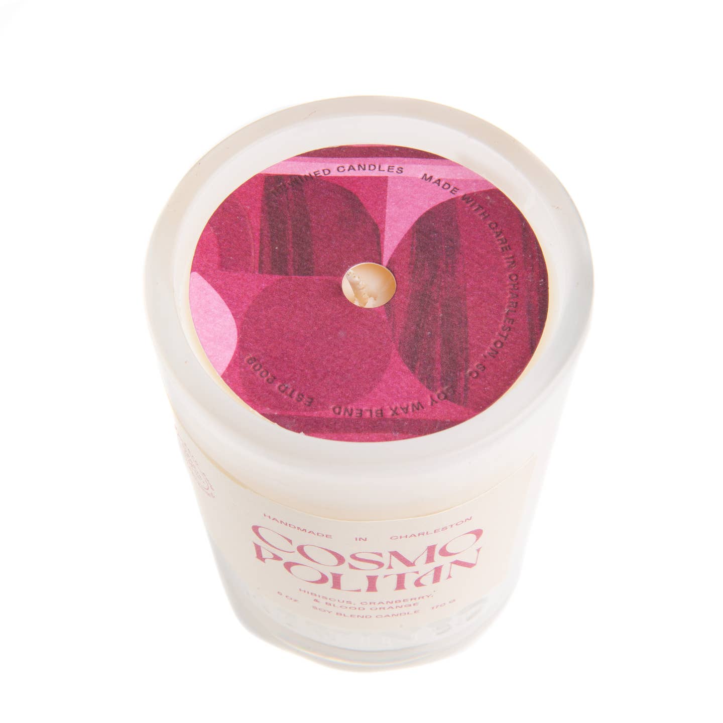 Candle with 'Cosmo Politan' text on a white background