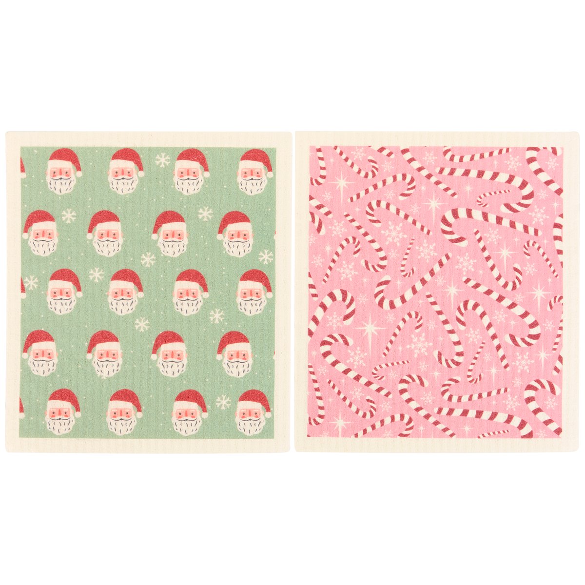 Safe to use on all types of surfaces, eco-friendly Swedish Dishcloths dry quickly and are antibacterial for more hygienic cleaning with reduced waste. This set of two Swedish Dishcloths features patterns of candy canes and Santa heads in a fun retro pastel style.