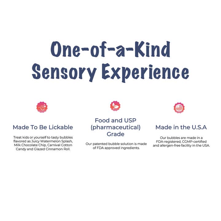 • SAFE & TASTY BUBBLES CREATED BY PEDIATRICIANS: BubbleLick, lickable, edible bubbles for children, adults, and pets. We made our bubbles safe, comprised of only Food-Grade and USP (Pharmaceutical) Grade ingredients.