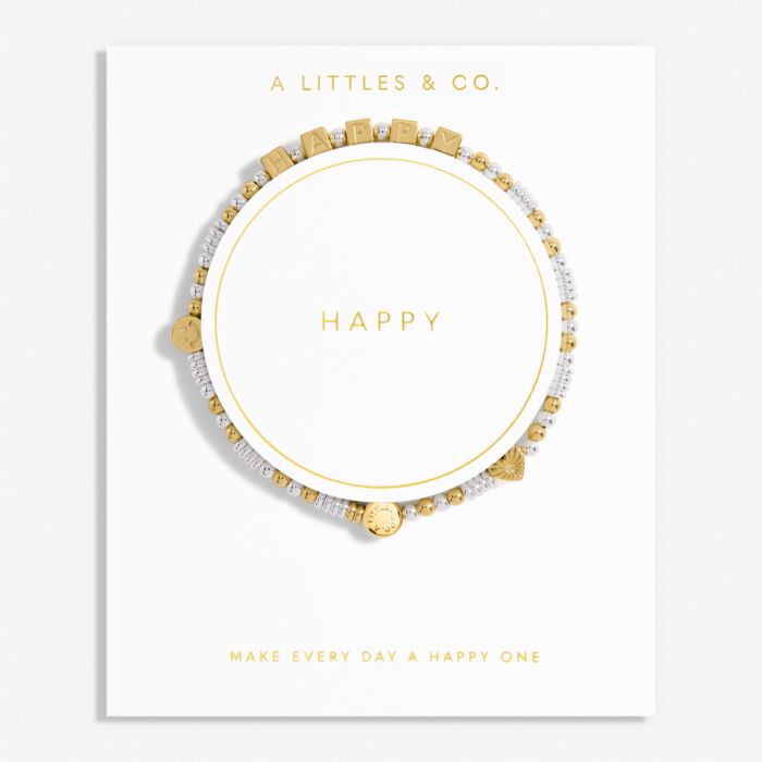With its colorful natural shells, alphabet beads, and charms as well as sentiment-stamped card backing, our Happy Little Moments 'Happy' Bracelet In Gold-Tone Plating radiates the happiest vibes.