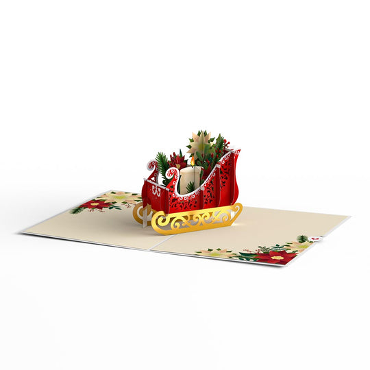 The front of this card wishes your recipient "Happy Holidays" in red text topped with a festive poinsettia against a winter white background. Inside, a 3D sculpture of a red and gold sleigh is beautifully decorated with a single lit candle surrounded by poinsettia, holly and pine trimmings.