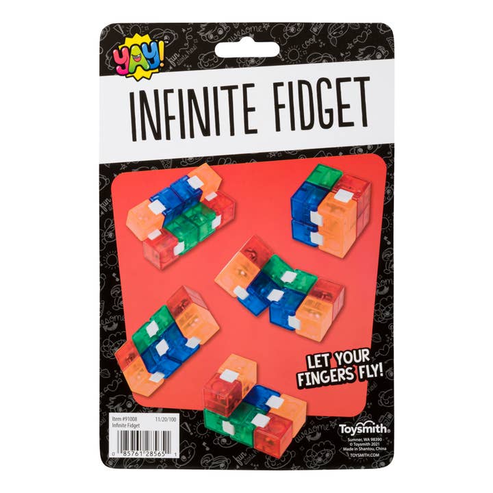 This multicolored fidget puzzle from YAY! challenges logic skills while having hands-on fun. Each Infinite Fidget toy is lightweight and made of plastic materials in red, orange, blue, and green. This fidget cube design is unique in that every colored cube can be rotated from any direction and angle thanks to flexible white connectors. Each Infinite Fidget toy comes in a peggable blister packet with hand illustrations.